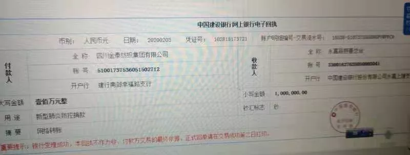 上午10時(shí)許,永嘉縣慈善總會(huì)收到了一筆特殊的網(wǎng)絡(luò)轉(zhuǎn)賬,記者在中國(guó)建設(shè)銀行網(wǎng)上銀行電子回折單上看到,付款人是四川金泰紡織集團(tuán)有限公司,用途上寫著新型肺炎防控捐款,金額為一百萬(wàn)元整。據(jù)永嘉縣慈善總會(huì)介紹,這筆捐款也是目前我縣收到的單筆最高捐款。